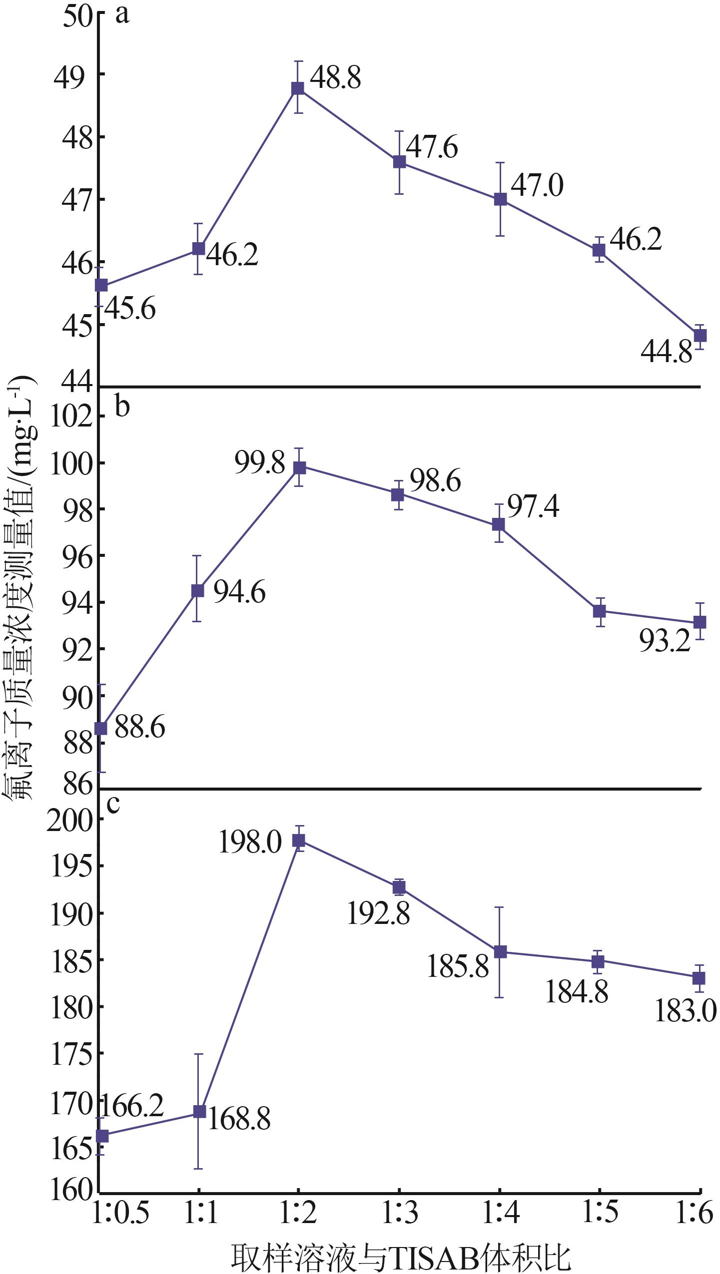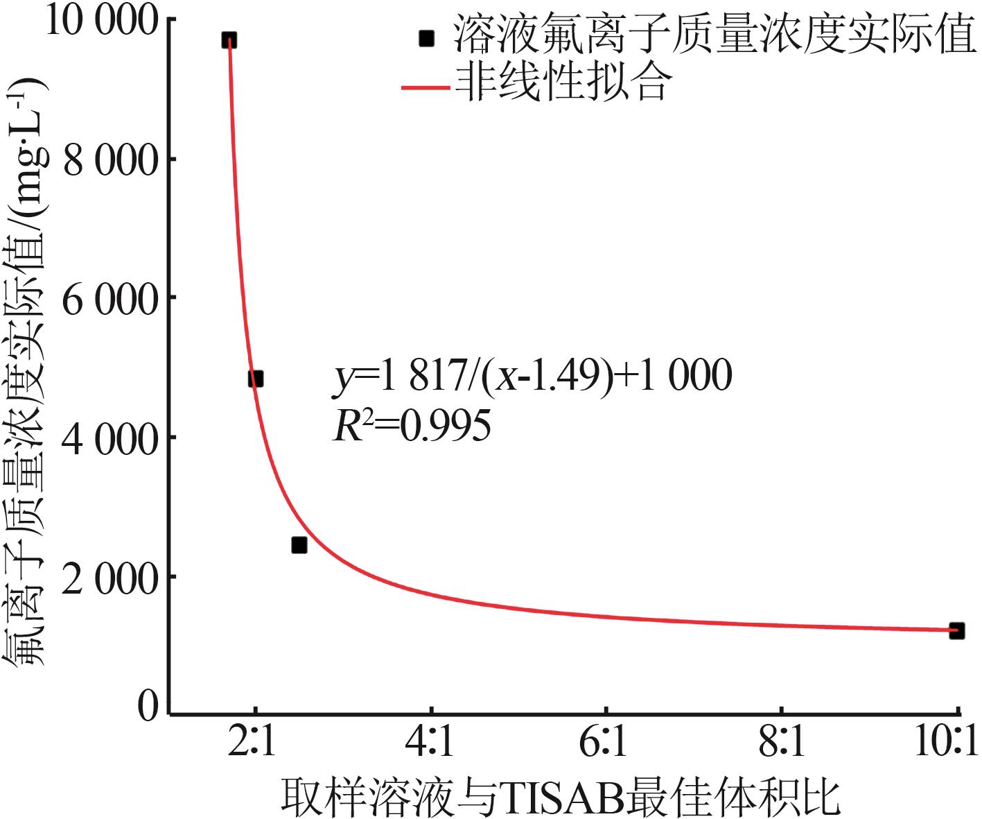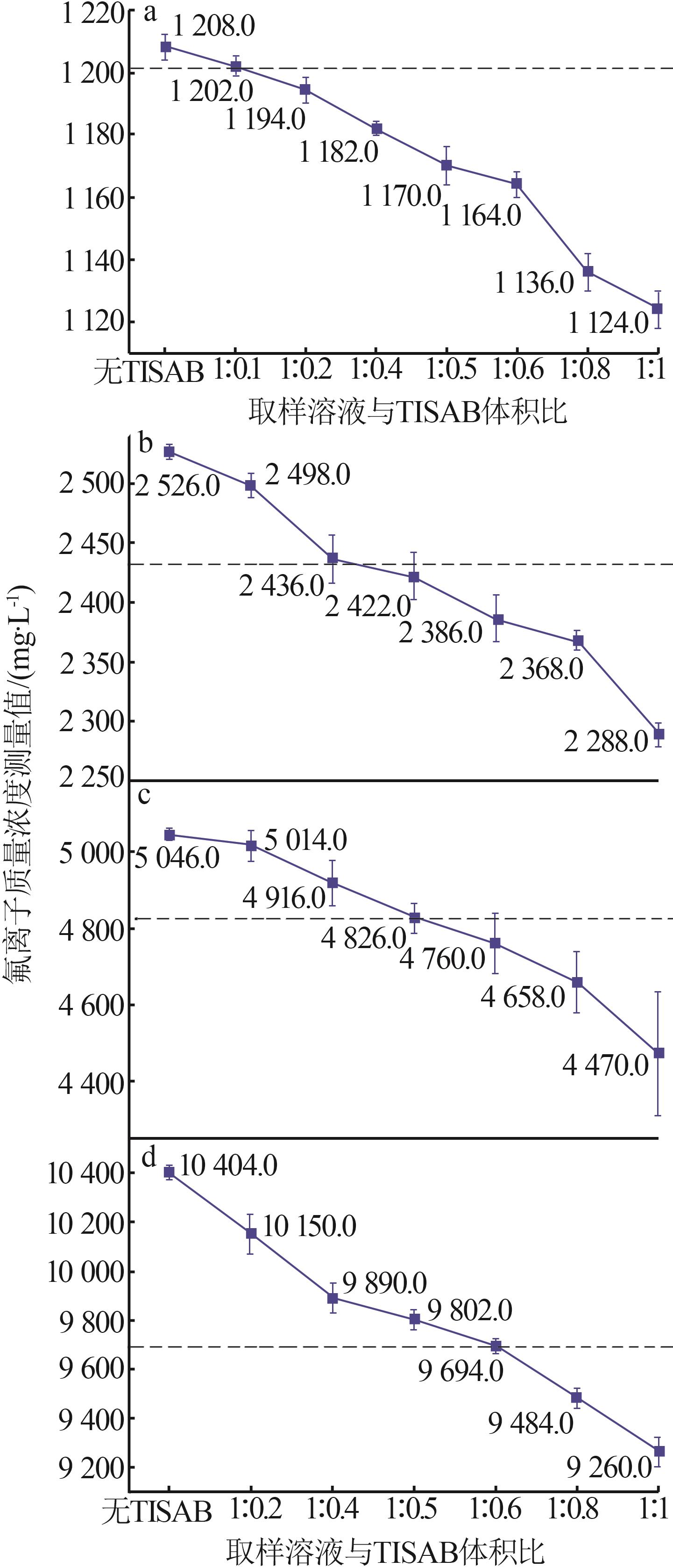 At present,the mainstream method for determining the mass concentration of fluoride ions in solutions is the fluoride ion selective electrode method,which is widely recognized for its advantages of simple operation,rapidity and high accuracy.However,when it is directly applied to the fluorine-containing solution with complex components produced during the treatment of hazardous waste in the aluminum industry,the accuracy will be greatly reduced.In order to improve the measurement accuracy,the prepared standard fluorine-containing solution was used as the research object to study the influence of the total ionic strength adjustment buffer(TISAB) on the analysis results. It was found that the appropriate dosage of TISAB was influenced by the concentrations of fluoride and aluminum ions in the solution.For solutions free of ions that could complex with fluoride,the volume ratio of the sample solution to TISAB could be set at 1∶0.5 for the preliminary test.Based on the preliminary test results,the ratio for the formal measurement could be adjusted by referring to the rule of the optimal volume ratio of different fluoride ion concentrations to TISAB.For solutions containing ions such as aluminum that could form complexes with fluoride,it was necessary to analyze the aluminum ion concentration and determine the dosage of TISAB to be added prior to the measurement.For solutions with an aluminum ion mass concentration higher than 120.0 mg/L,the aluminum ion mass concentration could be diluted to 120.0 mg/L,and the measurement could be performed with the volume ratio of the sample solution to TISAB of 1∶1.If the aluminum ion concentration was high while the fluoride ion concentration was too low,making excessive dilution inappropriate,the aluminum ion mass concentration could be diluted to 240.0 mg/L and the volume ratio of the sample solution to TISAB could be set to 1∶2,with a positive deviation of 4.50% added to the measured results.This method could control the error within 2.00% in the measurement of complex fluorine-containing solutions,and it provided a reference for the accurate determination of other fluorine-containing solutions with complex components.