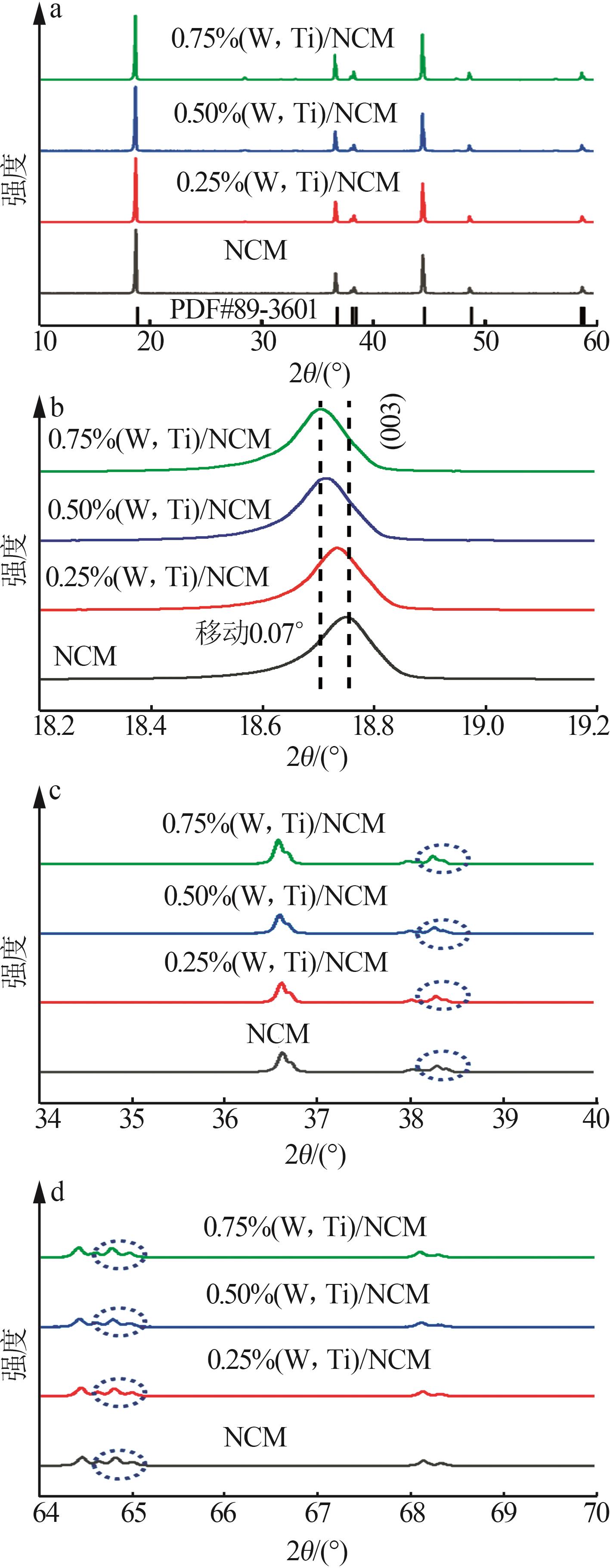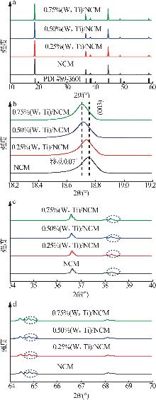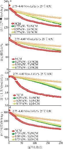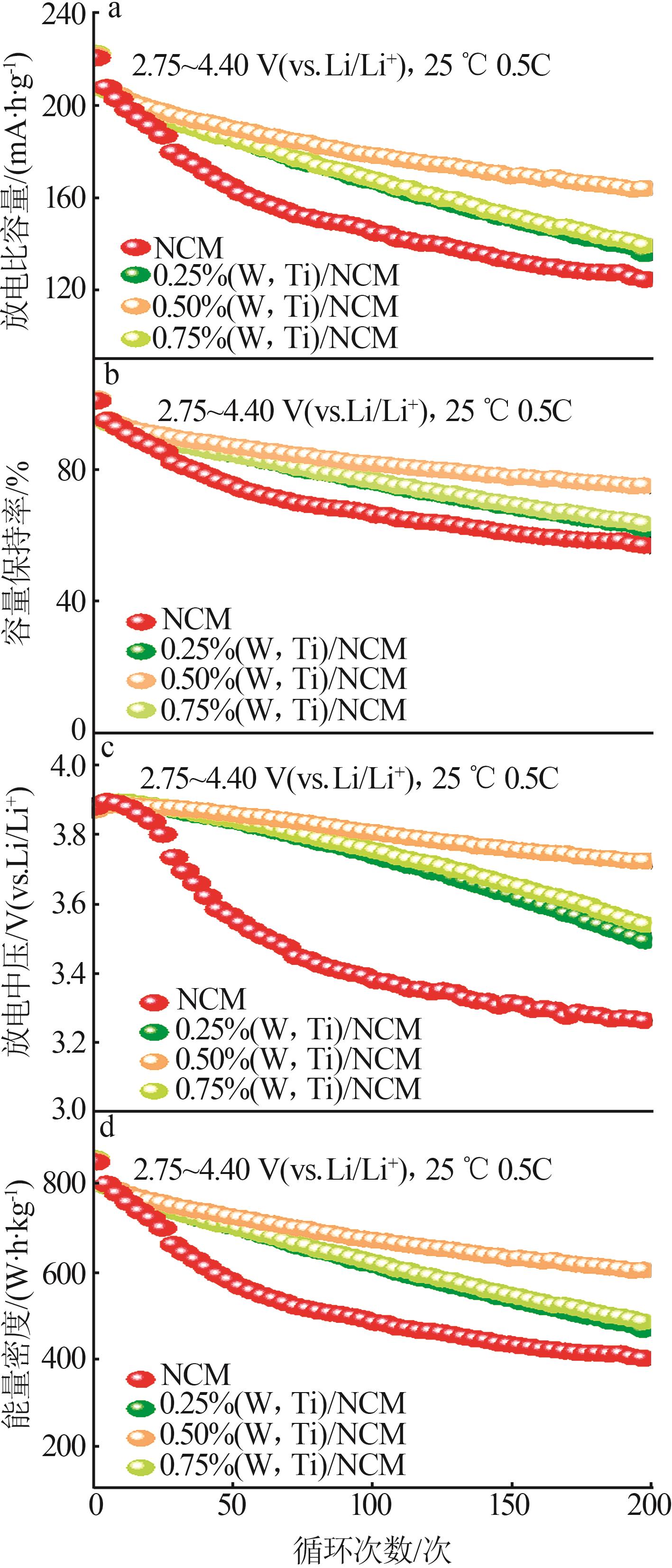 Lithium-ion batteries(LIBs) play a crucial role in electric vehicles(EVs),high nickel layered metal oxides (LiNi x Co y Mn1-x-y O2,NCM,x≥0.8) are one of the most important types of cathode materials for lithium-ion batteries.In order to improve the driving range of electric vehicles,increasing the nickel content in NCM cathode material can improve the actual specific discharge capacity of electric vehicles.However,high nickel content leads to structural instability of the cathode material and poor capacity retention ability.The strategy of doping exogenous elements can solve the above problems well.Using the method of solid phase sintering,a strategy of suppressing the volume shrinkage caused by lattice deformation by doping with high price W atoms was studied,while doping inactive Ti atoms to stabilize the rigid frame.This strategy significantly inhibited the concentration of stress,thereby stabilizing the structure,preventing the formation of micro-cracks,and improving electrochemical performance.Due to its unique structural characteristics,the initial capacity at 0.1C was 221.4 mA·h/g,the specific discharge capacity after 200 cycles at 0.5C was 162.9 mA·h/g,and the capacity retention rate was 74.6%.This study provided a new idea for the design of high performance layered cathode materials.