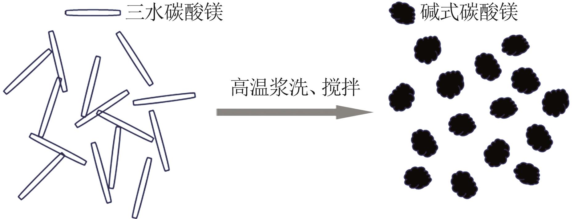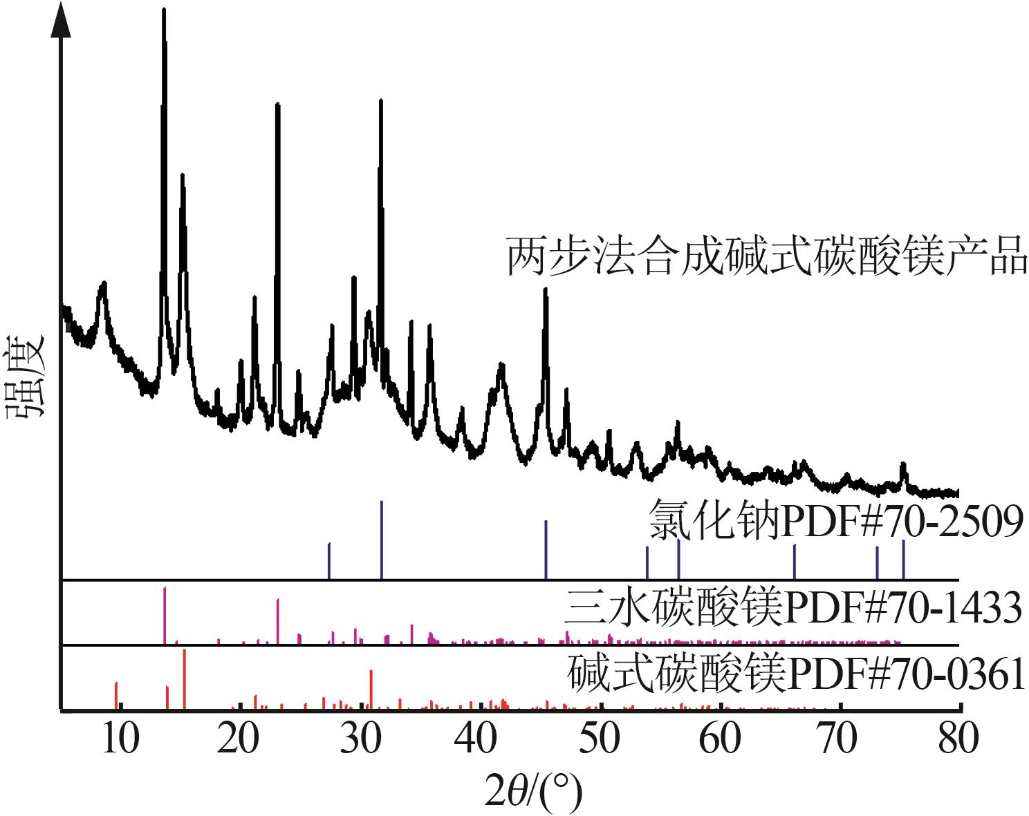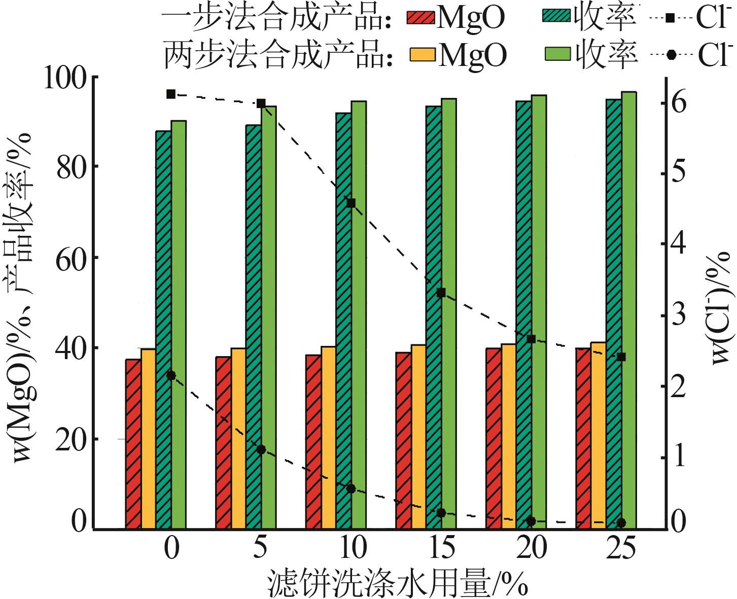 In order to solve the problem of high chlorine content in filter cake during the production of basic magnesium carbonate from the old brine of Qarhan Salt Lake,a new idea of using the old brine of Qarhan Salt Lake to prepare basic magnesium carbonate was put forward.The differences of water consumption and chlorine content between one-step method and two-step method in the preparation of basic magnesium carbonate were studied,and the crystal shape and morphology of the samples were characterized by XRD,SEM and other characterization techniques,and the mechanism of the reaction process was revealed.The test results showed that in the two-step synthesis process,the rod-like magnesium carbonate trihydrate was prepared firstly,which not only improved the filtration efficiency but also greatly reduced the chloride ion entraining rate in the filter cake.Compared with the one-step synthesis process,the chloride ion entraining content in the obtained solid sample was reduced from 6.12% to 2.16%(mass fraction) without using the leach solution.At the same time,the water consumption of the production was only 40% that of the one-step process.The content of MgO and Cl⁻ in the final product met the HG/T 2959—2023 standard of "Industrial hydrated basic magnesium carbonate" and the final yield could reach 97.06%.Therefore,the use of two-step synthesis of basic magnesium carbonate could obviously improve the problem of a large amount of water in the one-step process,and this process could provide an important reference for the preparation of basic magnesium carbonate from the old brine of Qarhan Salt Lake.