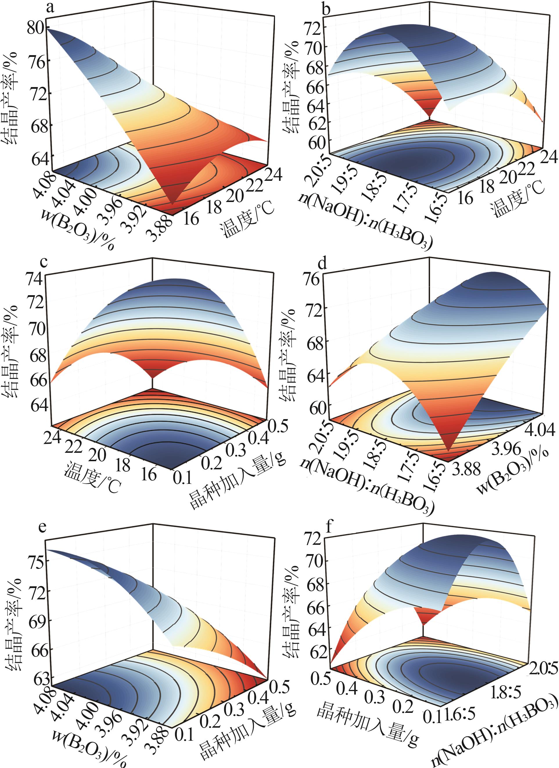 实验 号 | 温度(X1)/℃ | w(B2O3)(X2)/% | n(NaOH): n(H3BO3)(X3) | 晶种加入 量(X4)/g | 结晶产率/% | |